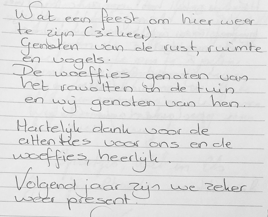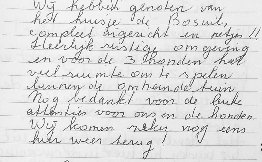 Vakantiehuis de Bosuil is uitstekend geschikt voor een droomvakantie met uw hond. Bij reserveren kunt u maximaal vier honden opgeven maar in overleg zijn ook meer honden welkom.