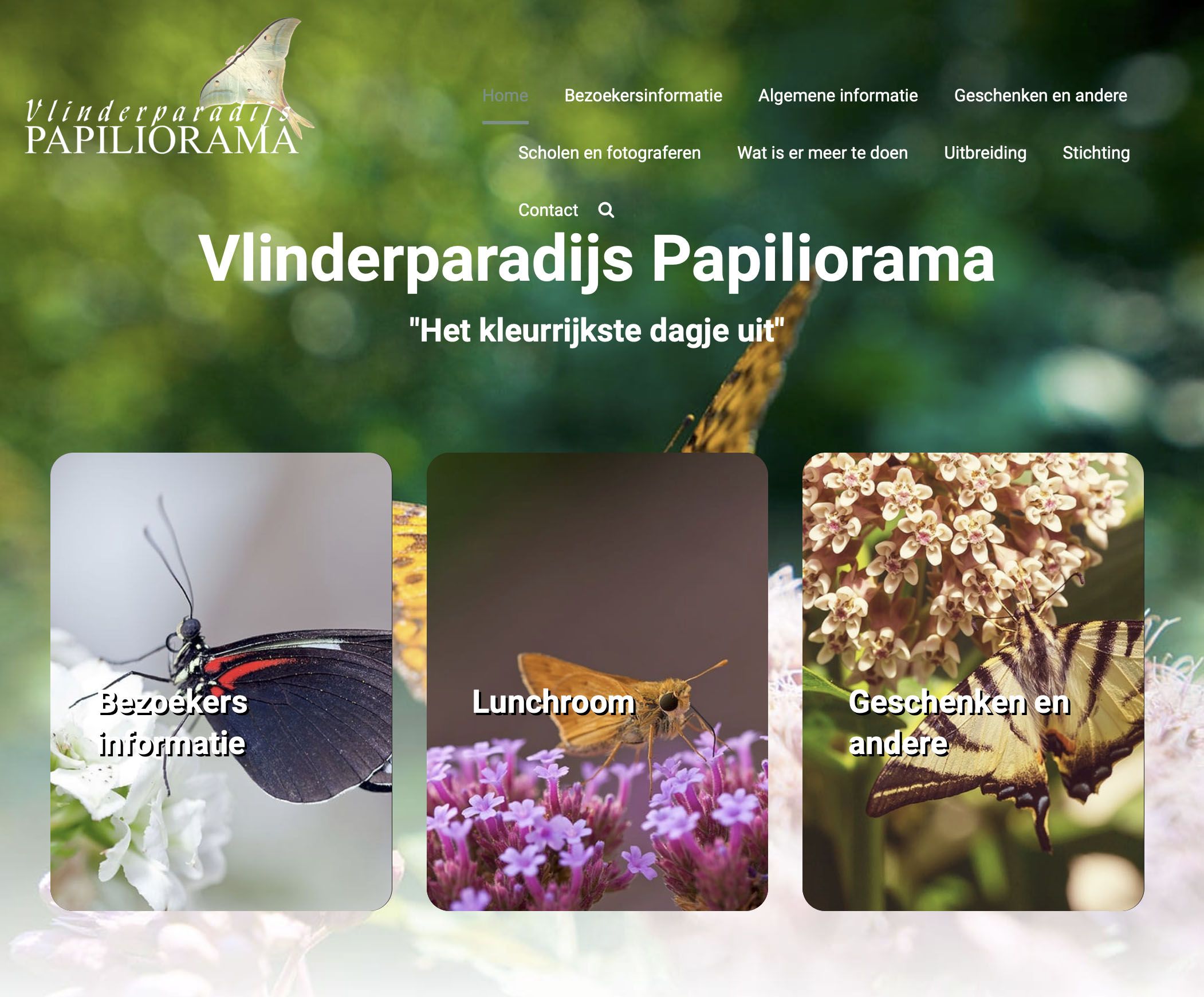 Iedere dag vliegen honderden vlinders uit diverse werelddelen op zoek naar nectar in de bloemen in daarvoor aangelegde stukje tropisch regenwoud. Tevens is er een lunchroom.